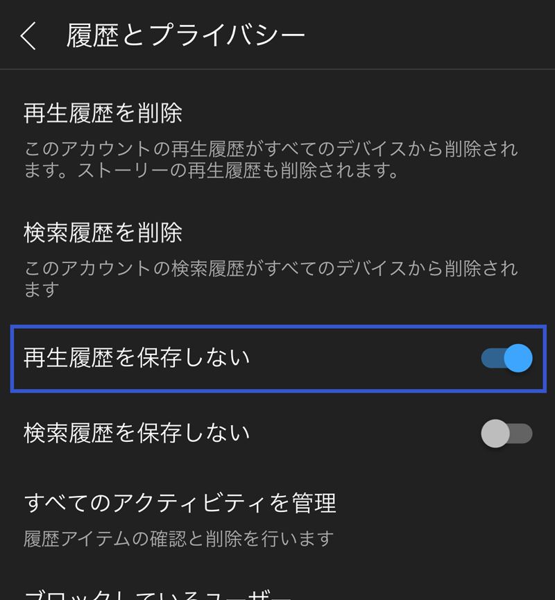 - 「再生履歴を保存しない」をタップします。注意書きが表示されますので、内容を確認の上で停止してください。
